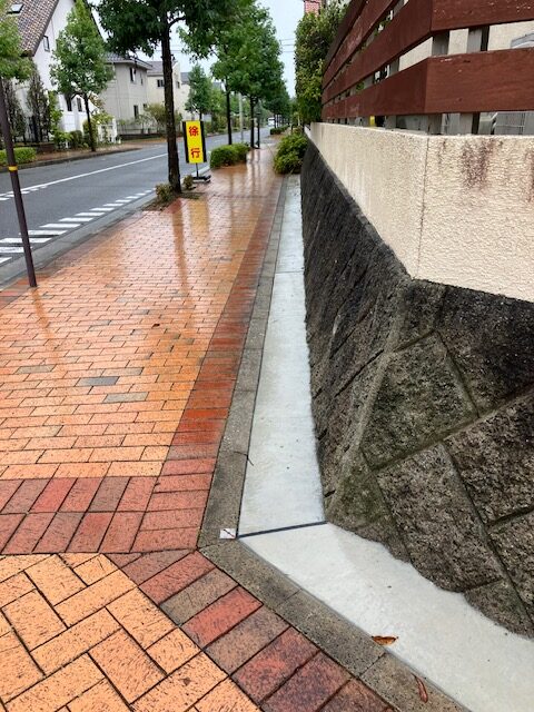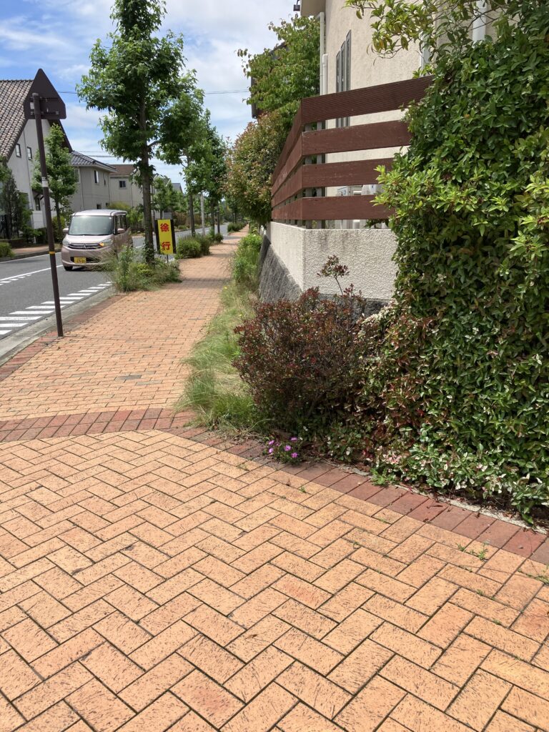 歩道と敷地の境界部分にある植栽は撤去しお手入れいらずの土間コンクリートに。